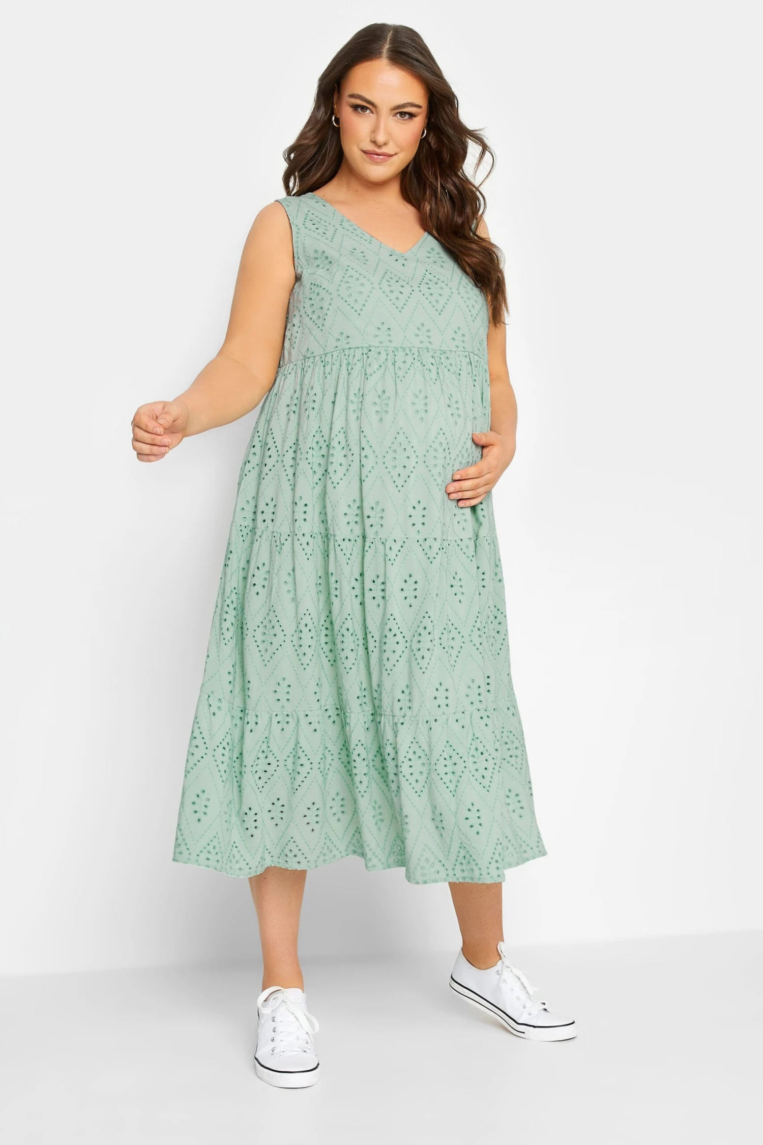 Resplendissez tout au long de votre grossesse avec notre robe midi verte pastel broderie Anglaise. Confortable et féminine, vous allez l’adorer.