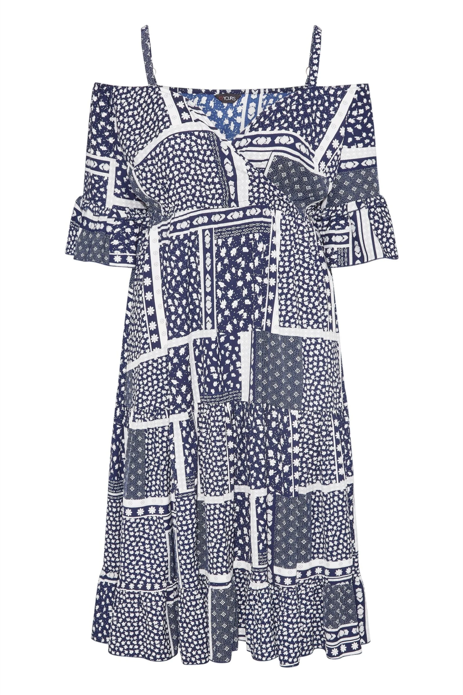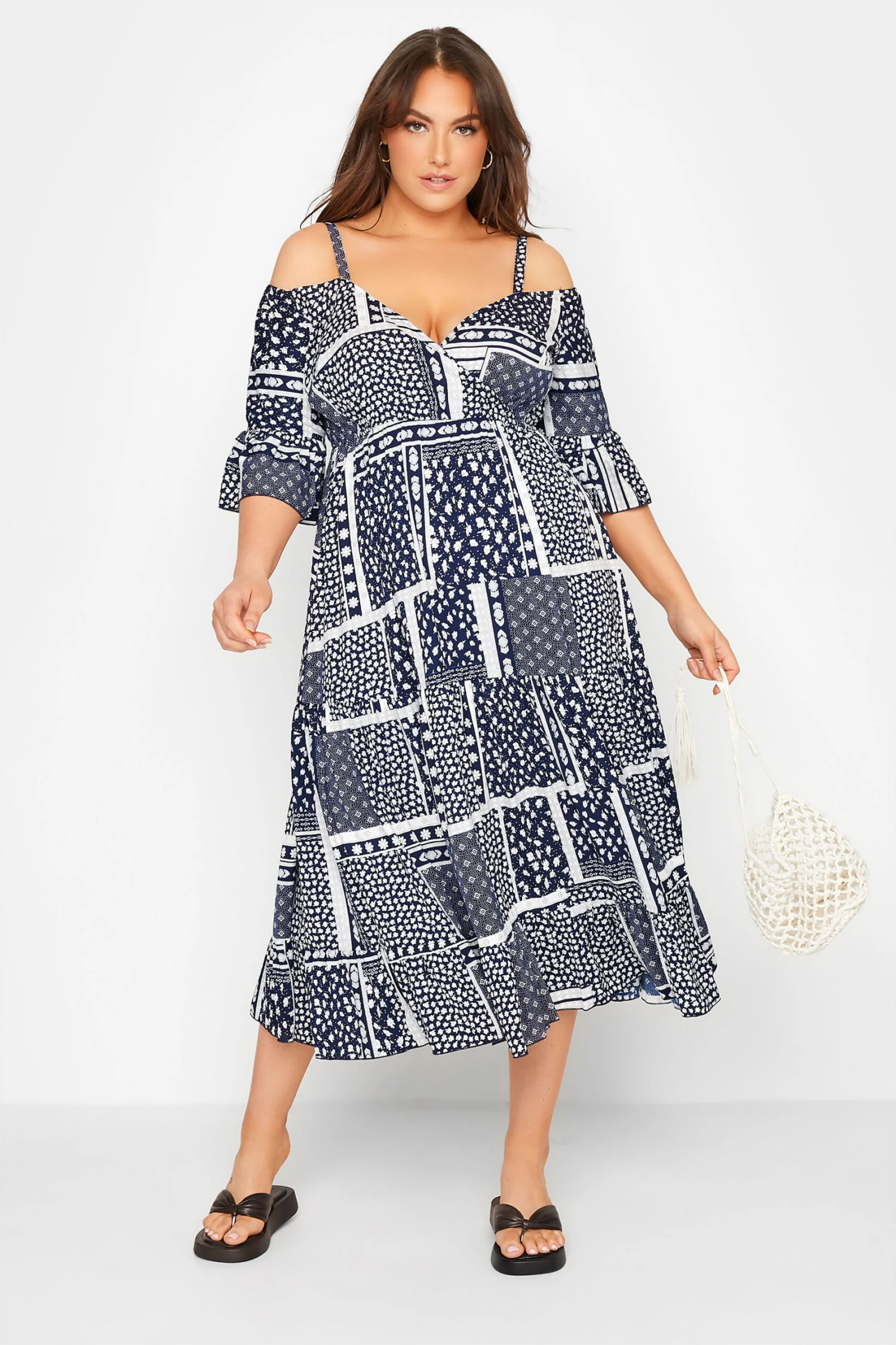 Craquez pour notre robe bleue marine et blanche bardot en patchwork. Confortable et lĂ©gĂšre, vous allez l’adorer!