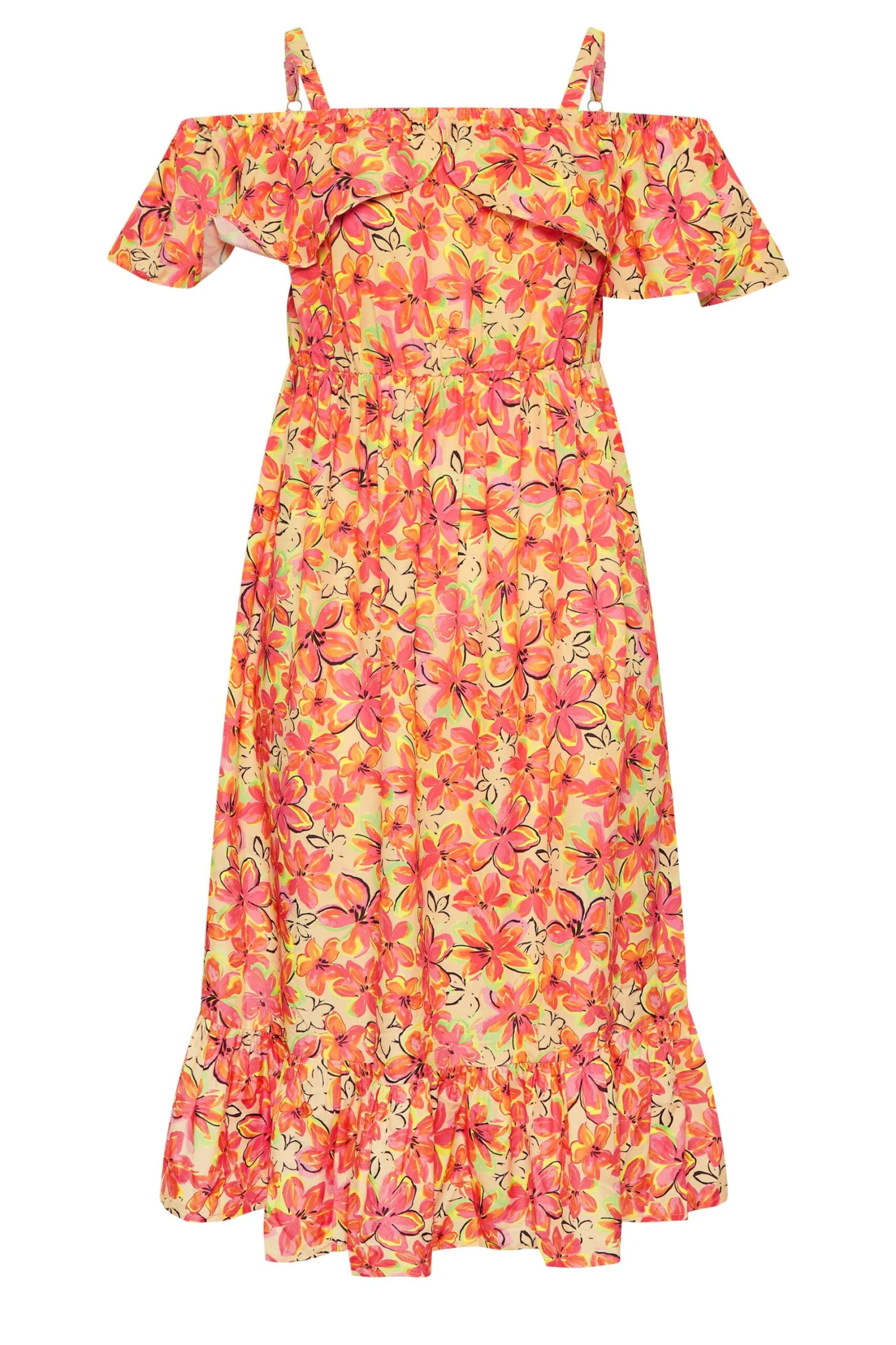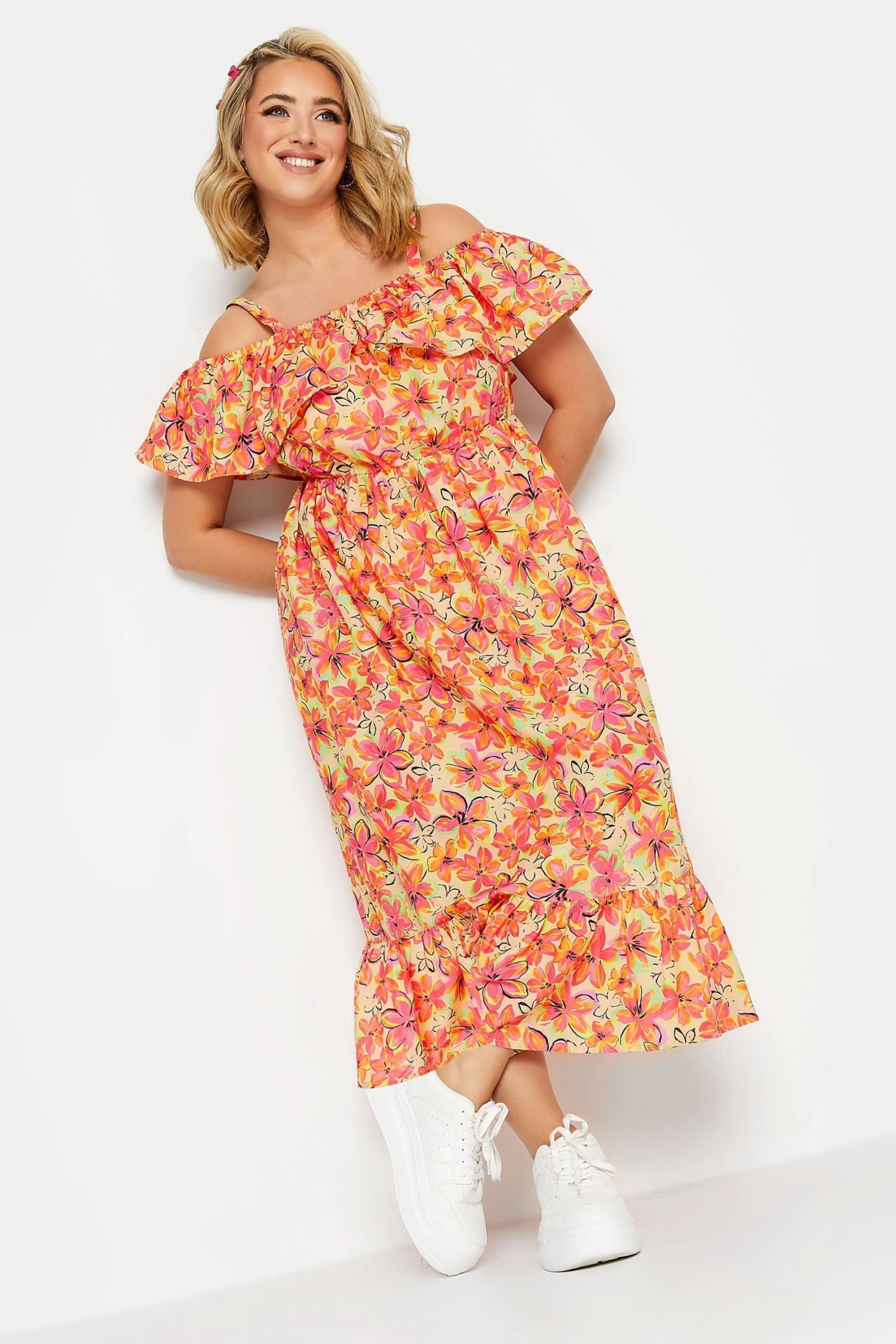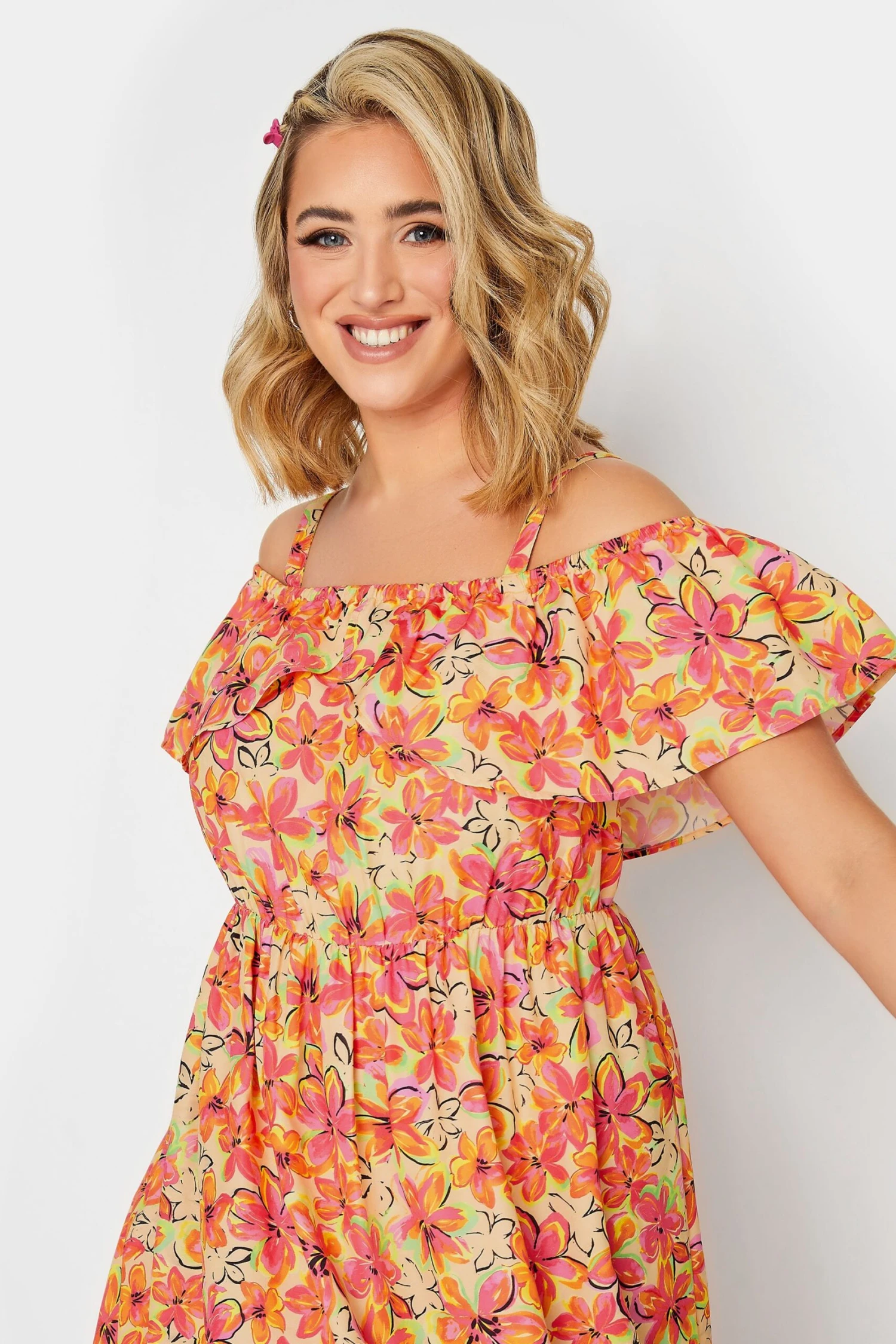 Ajoutez une touche de couleur à vos tenues de saison avec notre robe midi orange coupe bardot volanté. Féminine, colorée et tendance, vous allez adorer la porter cette saison.