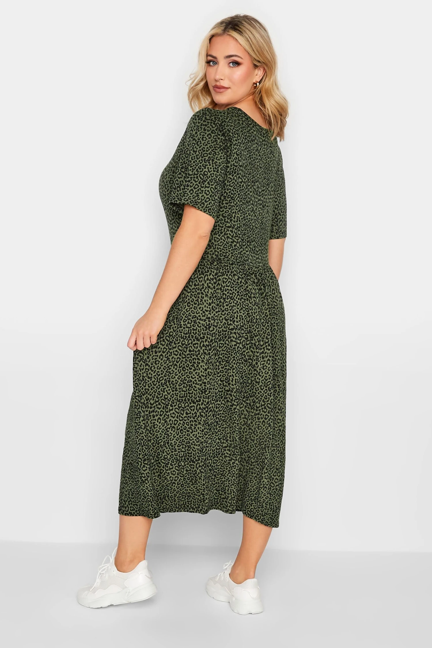 Craquez pour notre robe midi smocké verte kaki léopard. Confortable et délicate, vous allez adorer la porter cette saison.
