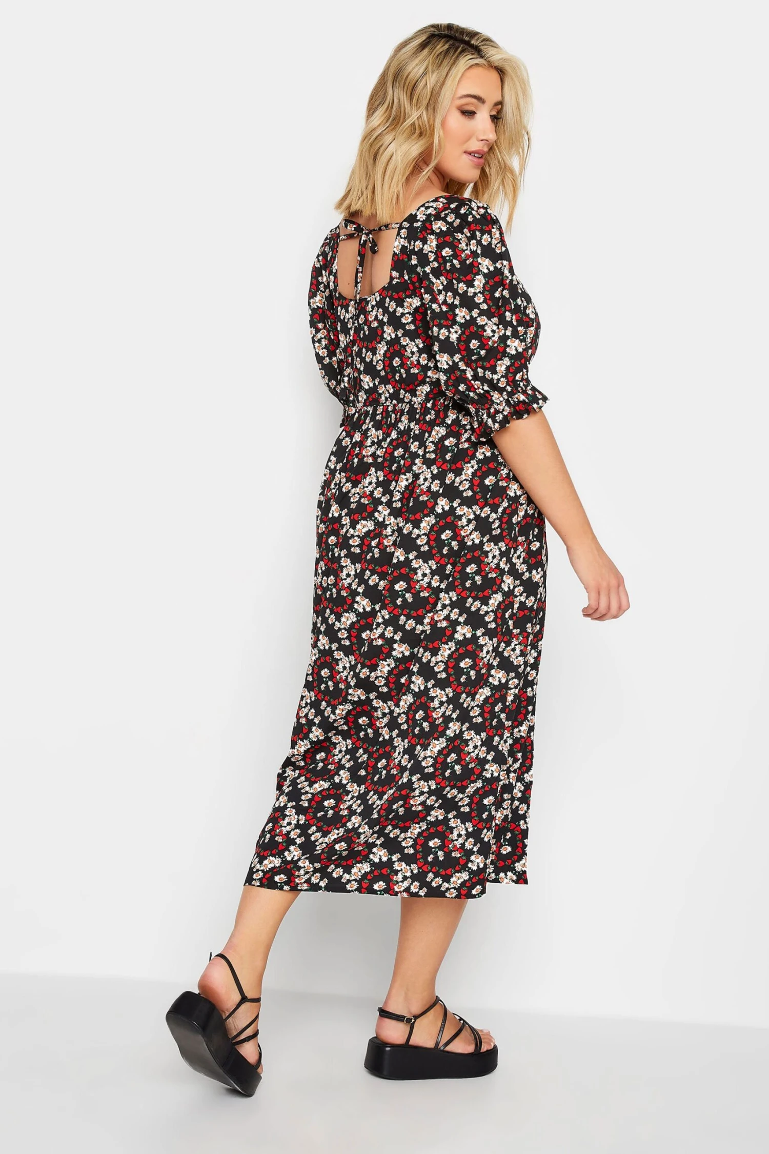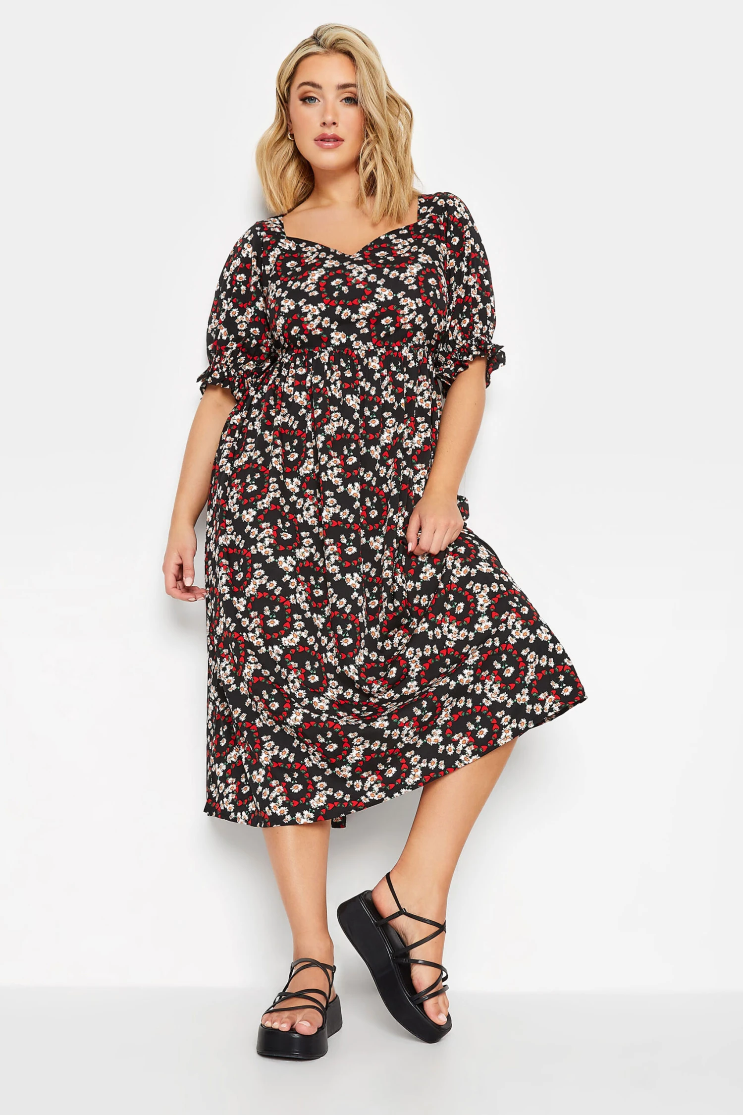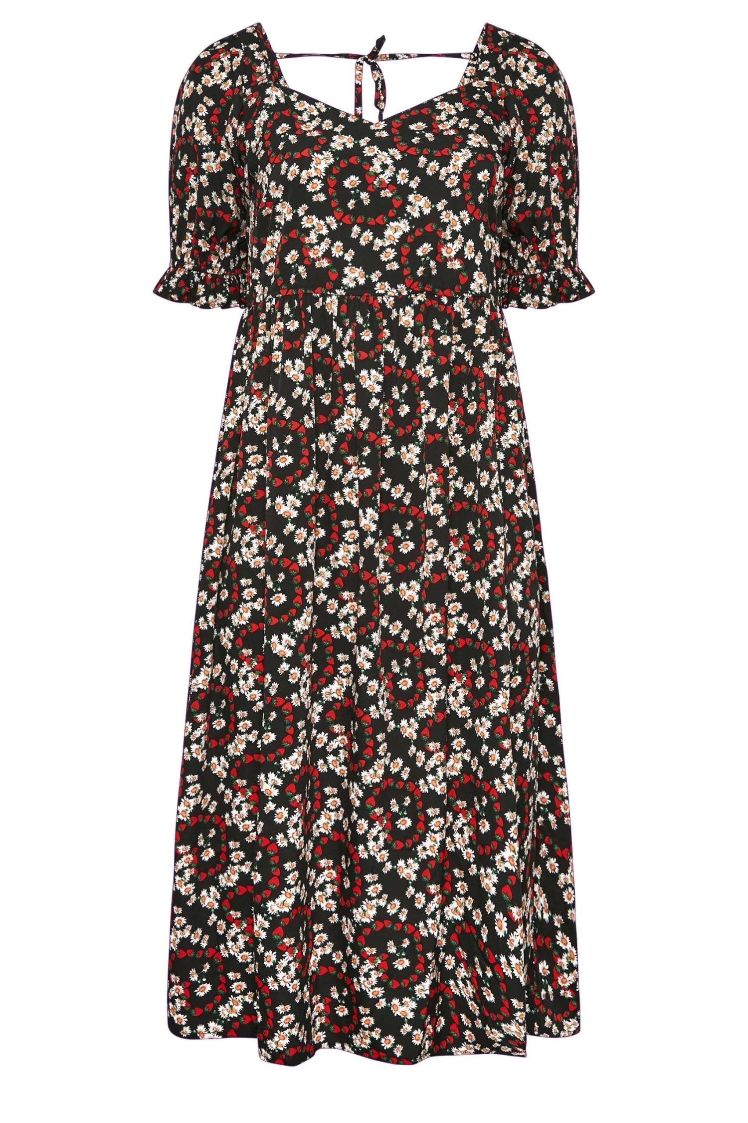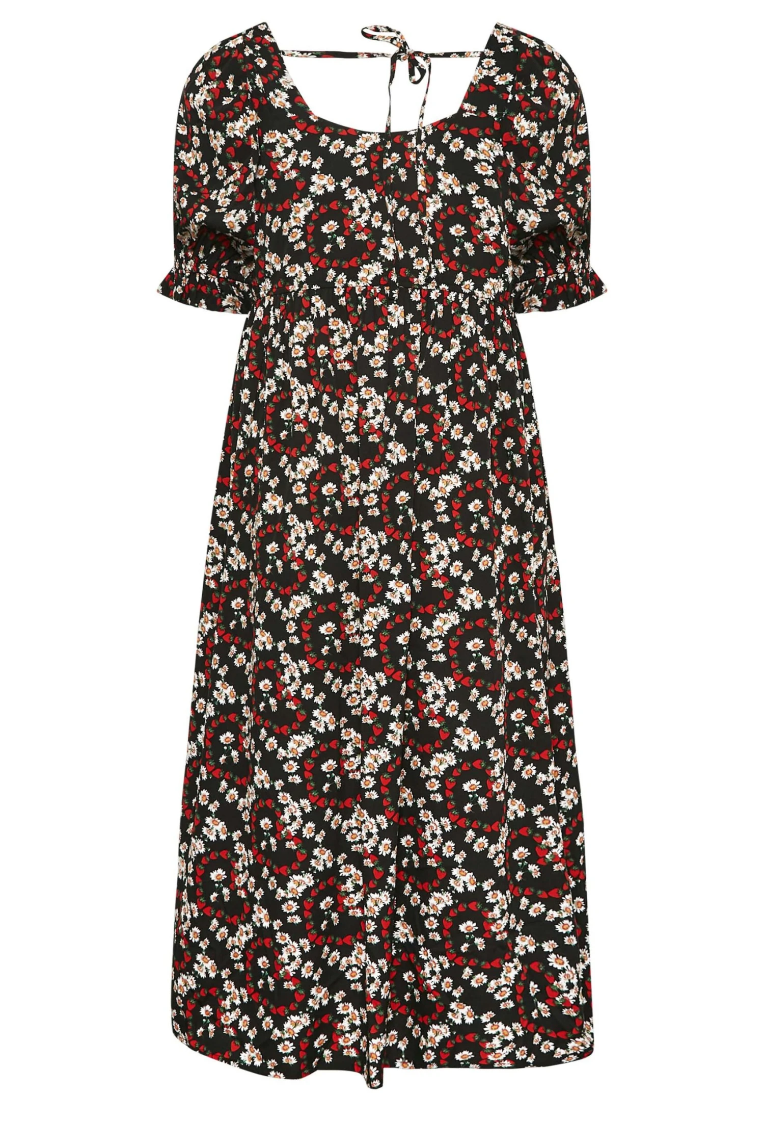 Ajoutez une touche de couleur à vos looks de saison avec notre robe noire floral rouge encolure coeur.