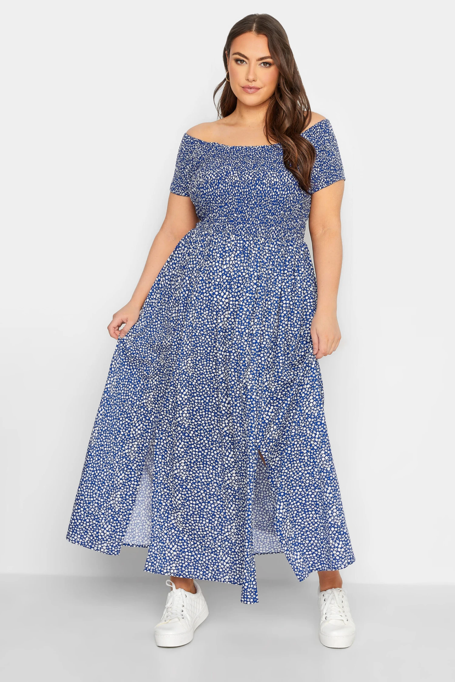 Craquez pour notre robe bleue petites fleurs en bardot manches courtes. Tendance et lĂ©gĂšre, vous allez l’adorer.