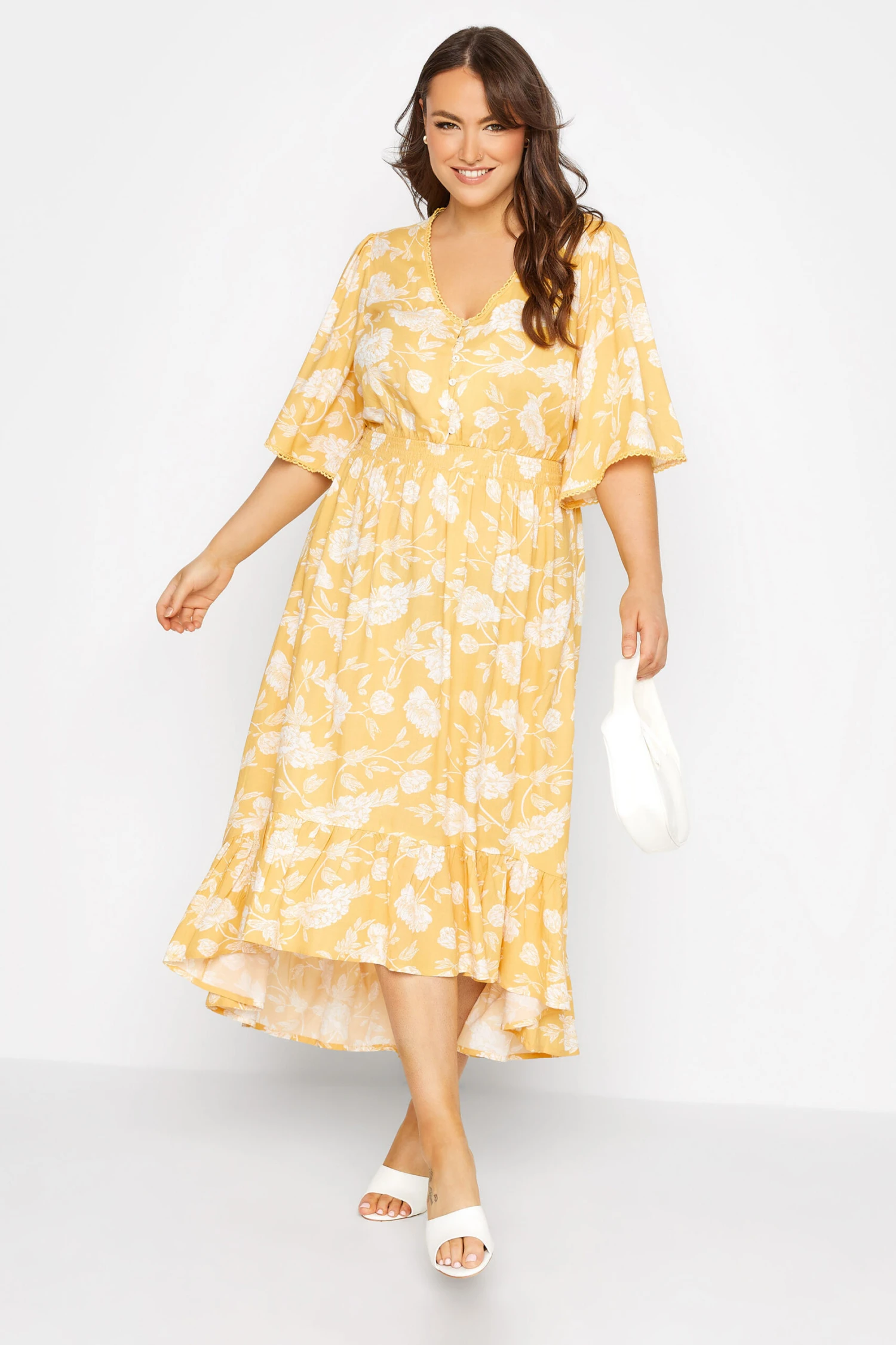 Craquez pour notre robe jaune floral ourlet plongeant volanté. Raffinée et légère, vous pourrez la porter en plusieurs styles.