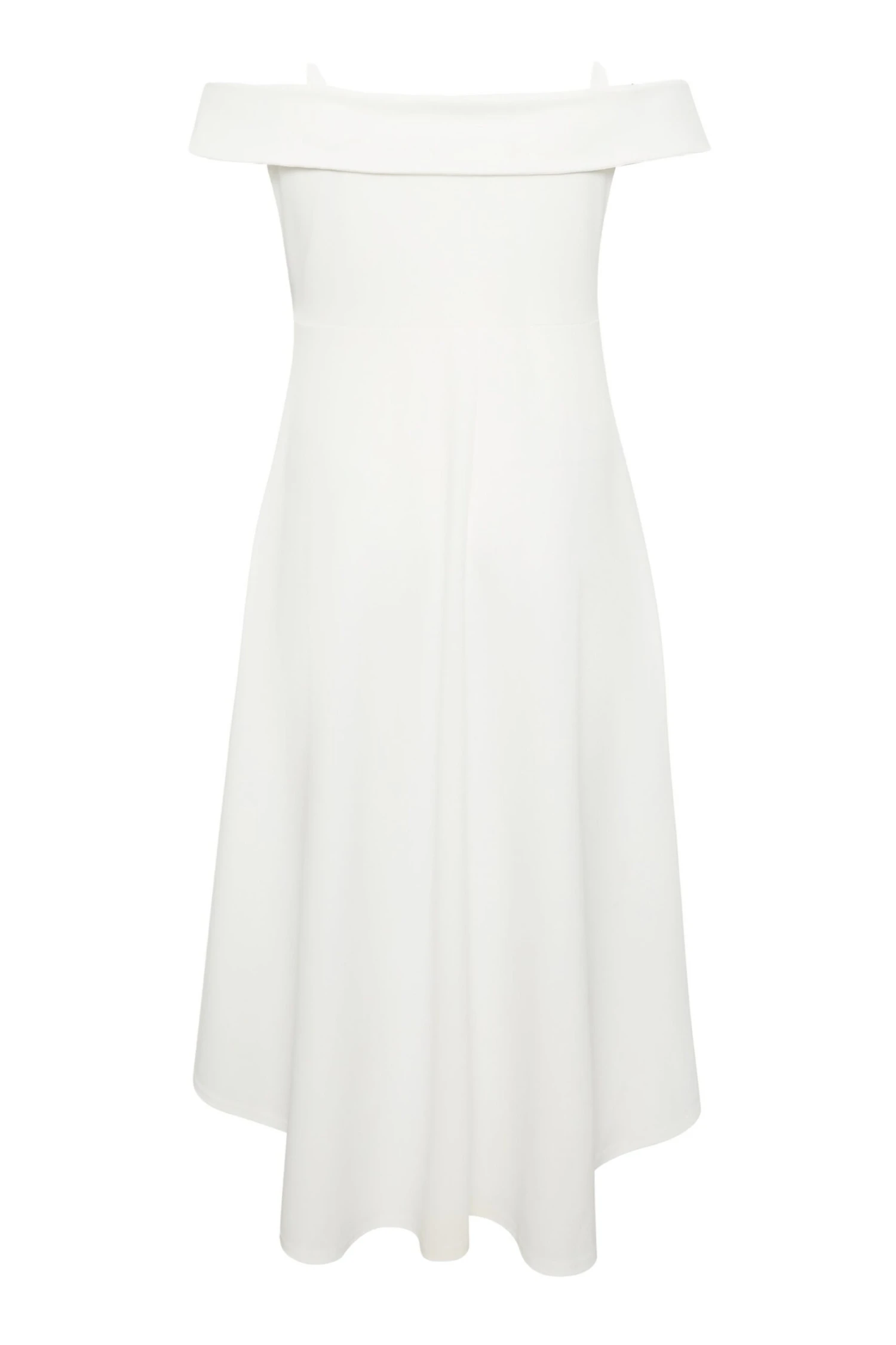 Resplendissez lors de vos prochaines occasions spéciales avec notre robe blanche midi coupe bardot ourlet plongeant.