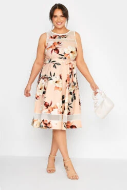 Craquez pour un style classe pour vos sorties cette saison avec notre robe rose saumon floral patineuse avec ceinture Yours London.