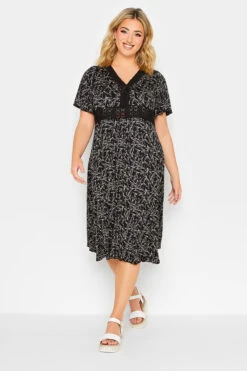 Faites le plein de robes tendances de saison avec notre robe noire asbtrait empiècement dentelle manches courtes.
