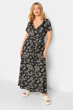 Faites le plein de robes tendances cette saison avec notre robe noire maxi cache-coeur design feuilles. Vous allez l’adorer!